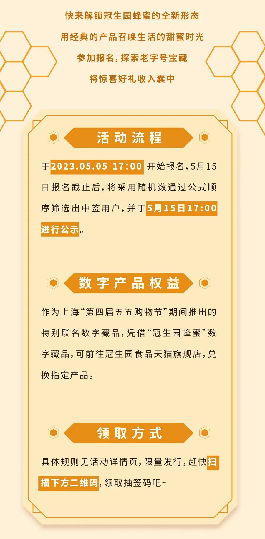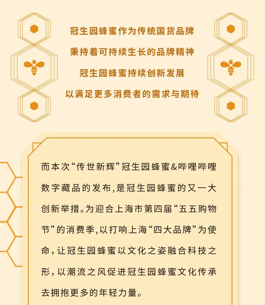 本次“傳世新輝”冠生園蜂蜜&嗶哩嗶哩數字藏品的發布,是冠生園蜂蜜的又一大創新舉措。為迎合上海市第四屆“五五購物節”的消費季,以打響上海“四大品牌”為使命,讓冠生園蜂蜜以文化之姿融合科技之形,以潮流之風促進冠生園蜂蜜文化傳承去擁抱更多的年輕力量。